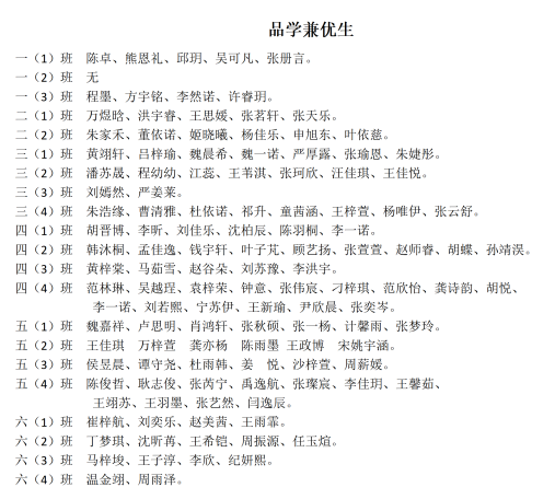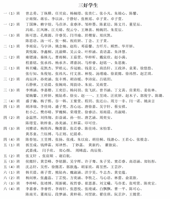 根据《苏州市彩香实验小学“三好学生”、“品学兼优生”等优秀学生推荐评选实施细则》,经学生本人自荐、班级民主评议并结合学生实际情况,通过各班推选、德育处审核,现将2025-2026学年度第一学期“三好学生”、“品学兼优生”、“彩香娃”评选结果进行公示。公示时间为:2026年2月3日-2026年2月5日。